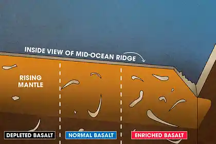 Ученые сравнили соотношение между разными типами базальтов хребтов — химически истощенных (D-MORB) и обогащенных (E-MORB). Истощенные базальты формируются при низкой степени плавления, в то время, когда из решеток минералов извлекаются несовместимые с катионными центрами элементы, а в обогащенных базальтах, напротив, такие несовместимые элементы видятся чаще. Ранее считалось, что E-MORB образуются из расплавов в районе мантийных плюмов, но потом стало известно, что кое-какие обогащенные базальты видятся далеко от тех мест, где потоки мантии поднимаются к поверхности. Исследователи удостоверились в надежности, имели возможность ли эти базальты принадлежать старой коре.
